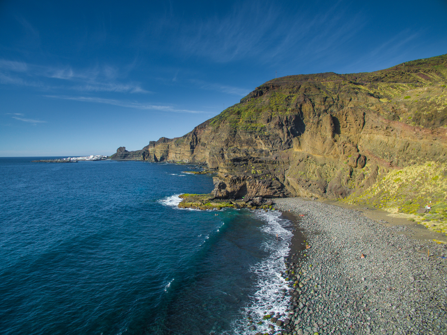 The views from the sand are fantastic as you see Tenerife and Teide on the horizon, Puerto de las Nieves to the north and the rugged west coast stretching out to the south. Take care swimming at