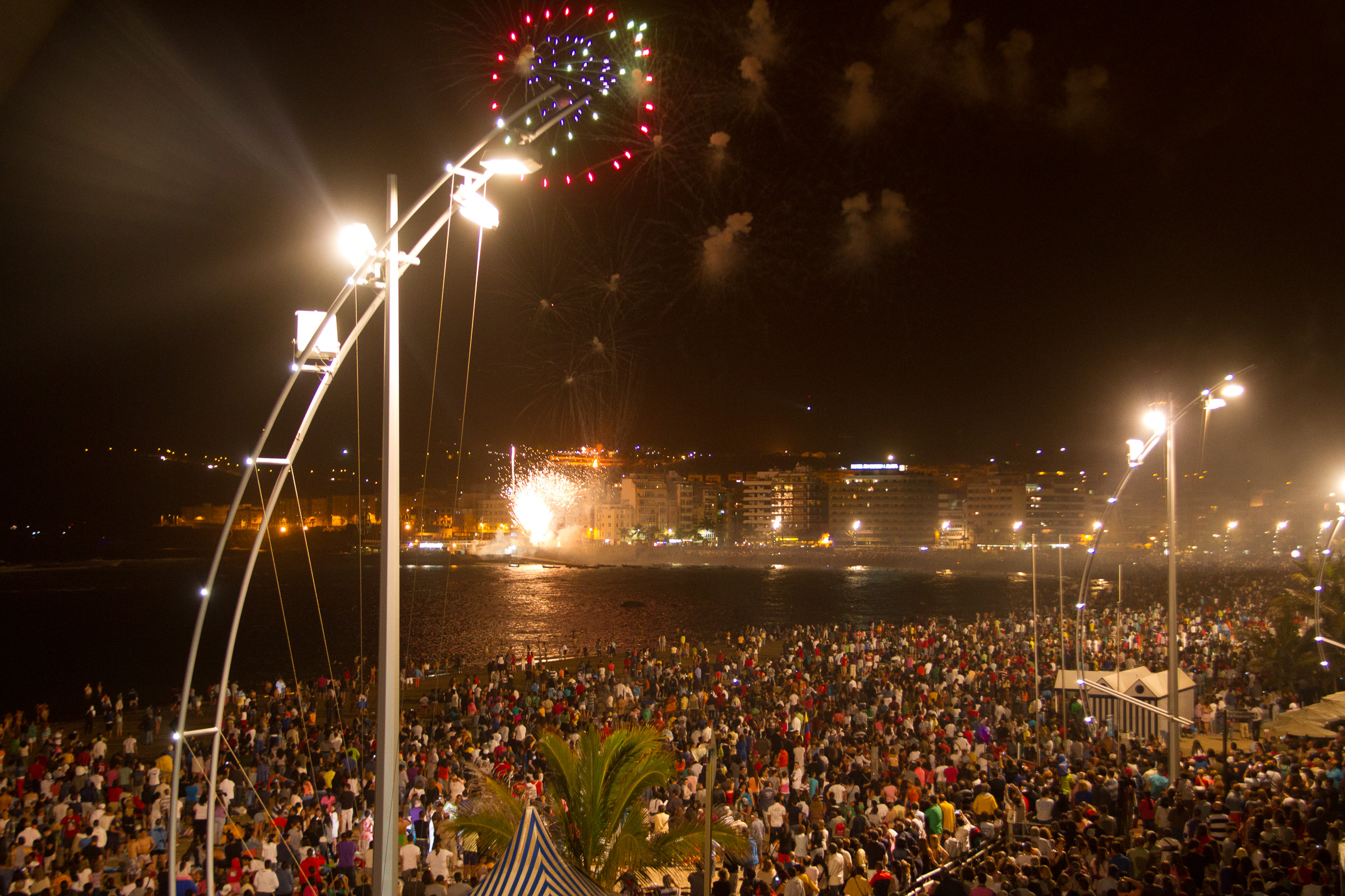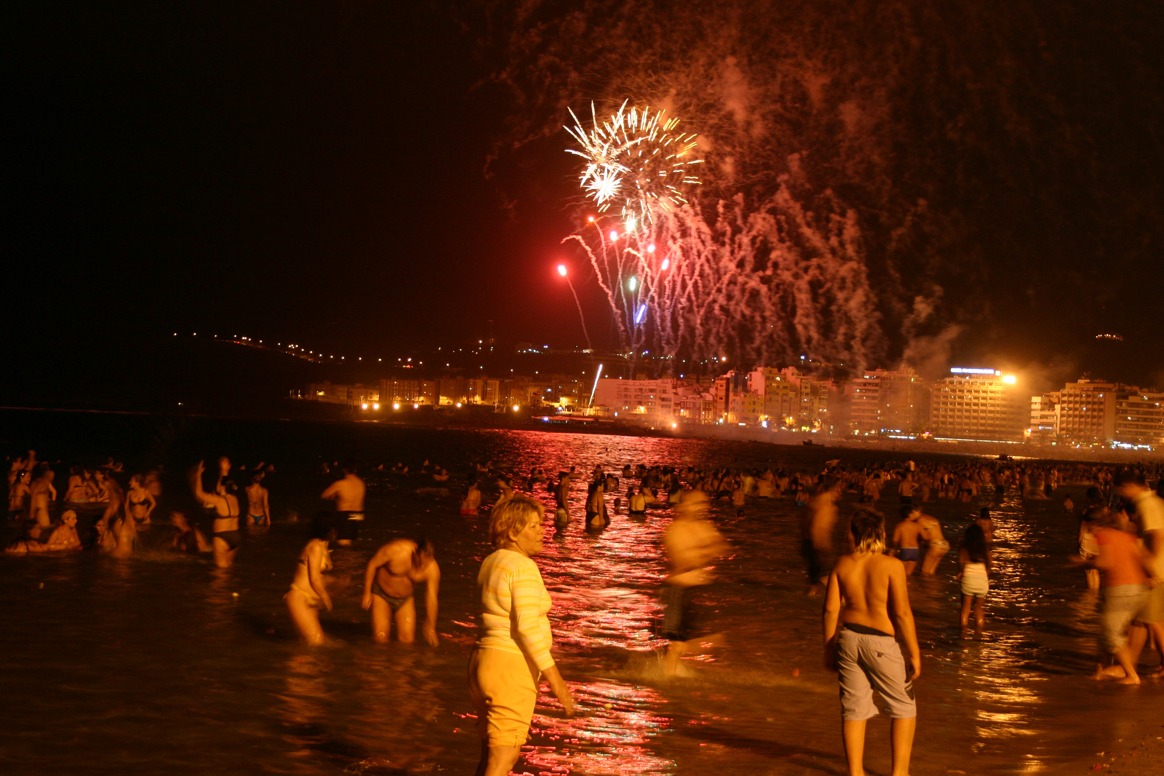 Playa del Ingles puts on a beach party at the Anexo 1 shopping centre down by the beach. There's a drumming procession, fire procession and a huge bonfire plus fireworks at midnight, live music and DJ.