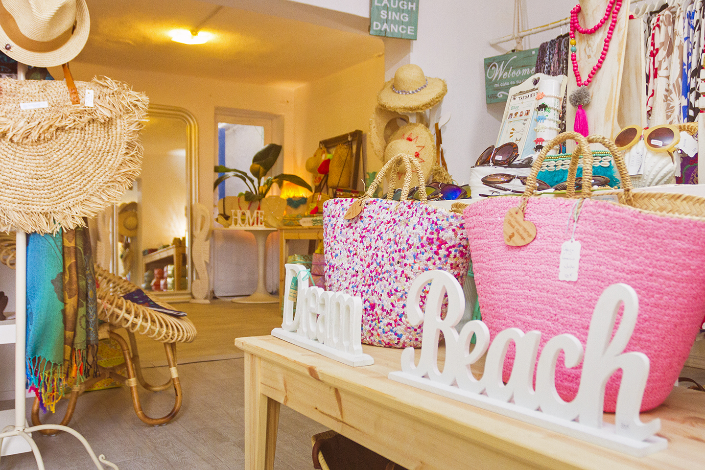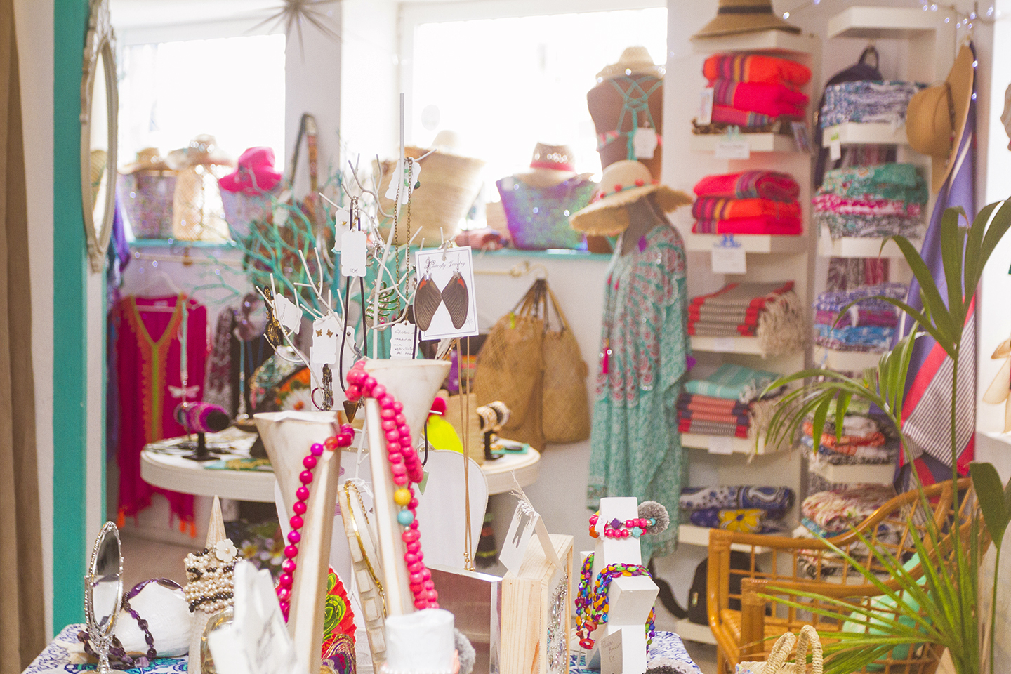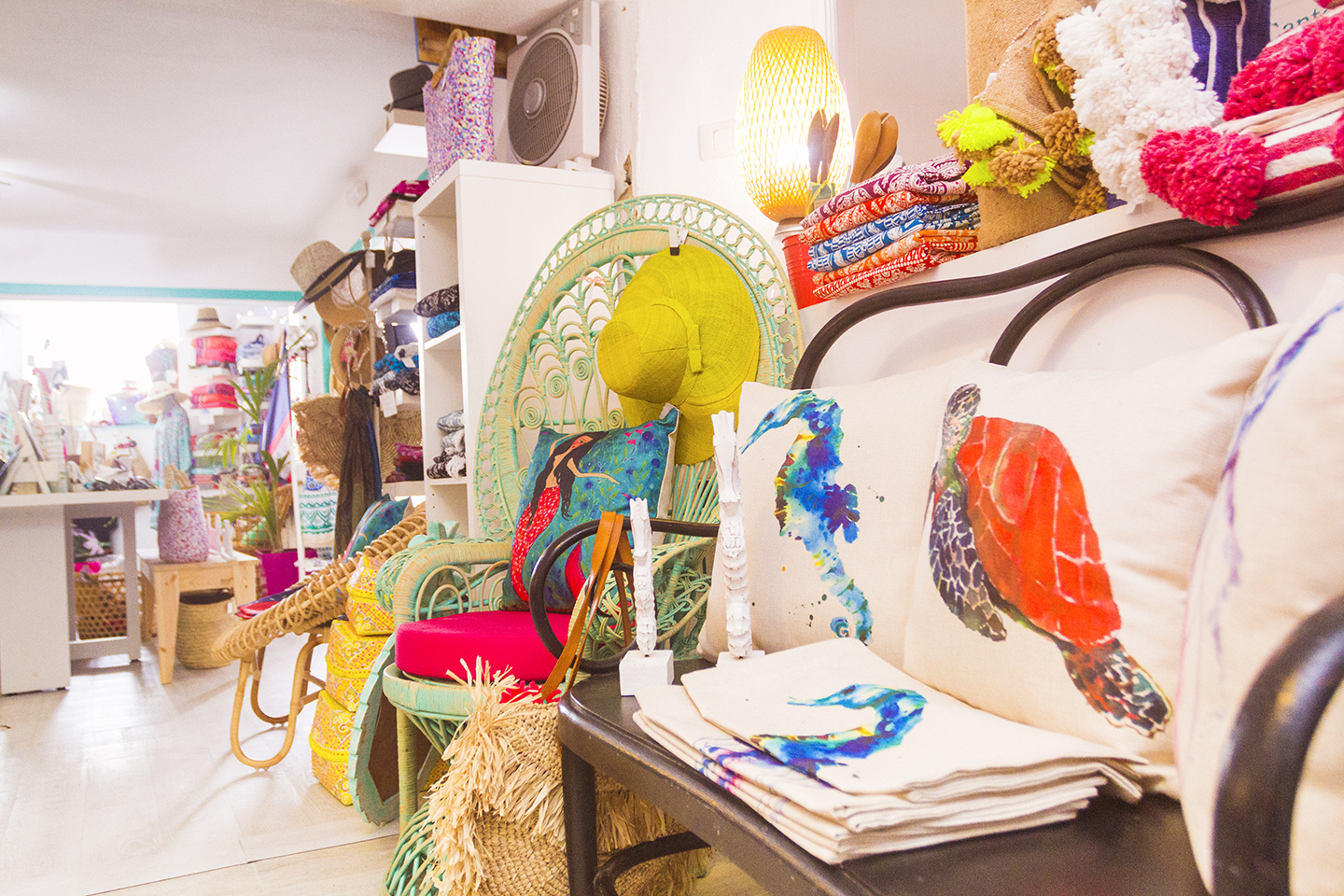 Once you're inside you'll find a cool (literally on a hot day) space packed with everything from jewelry, fashion accessories, beachwear and the best hats in town. There's everything from kaftans, pareos and beach bags to handmade jewelry and beach-themed cushion covers, rattan mirrors and carvings.