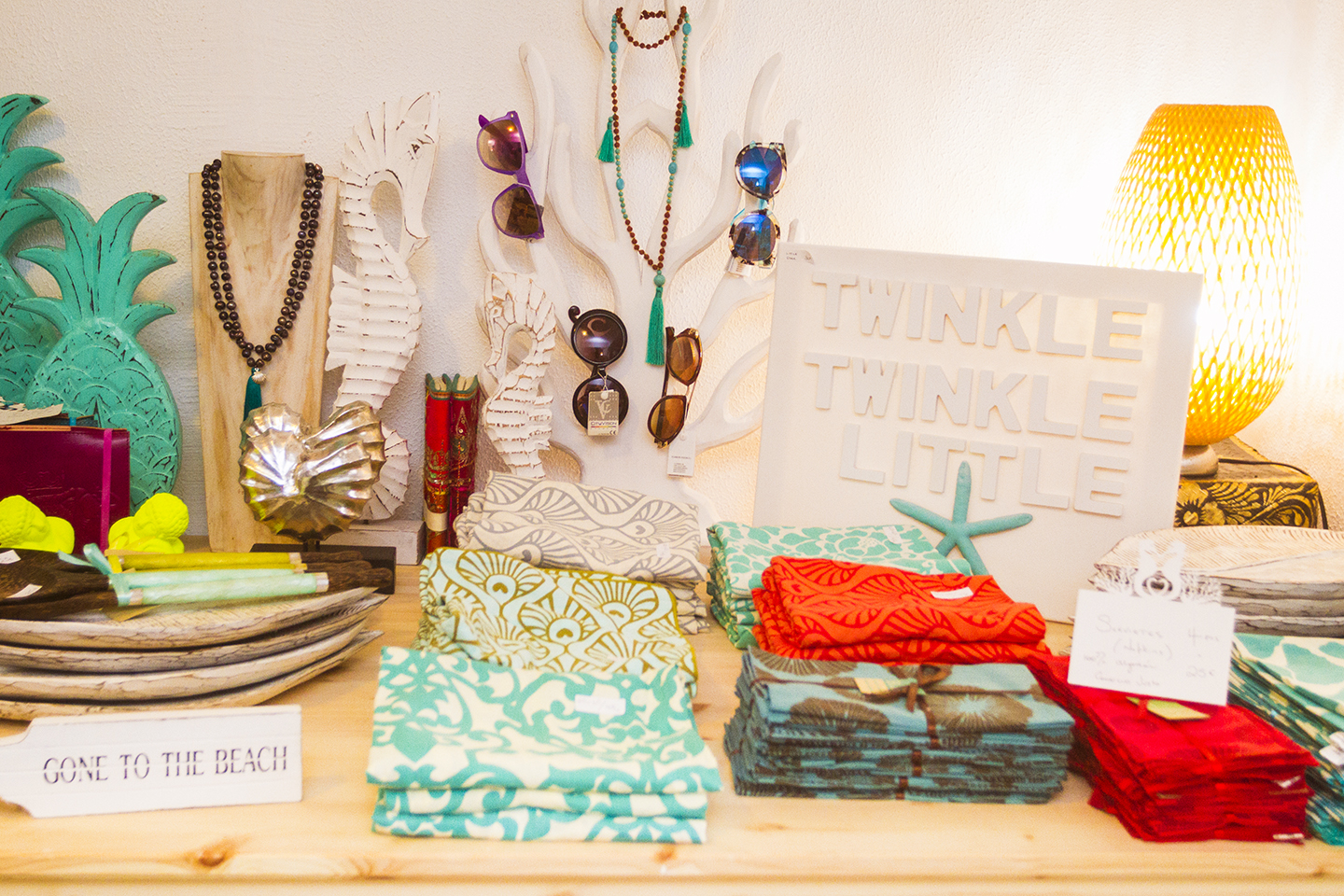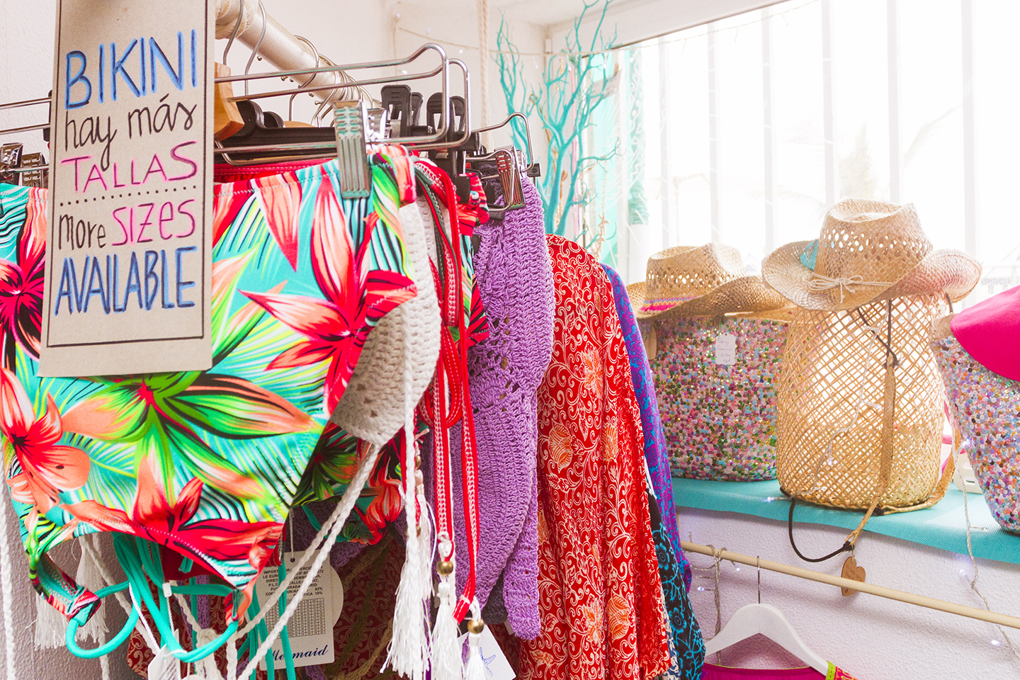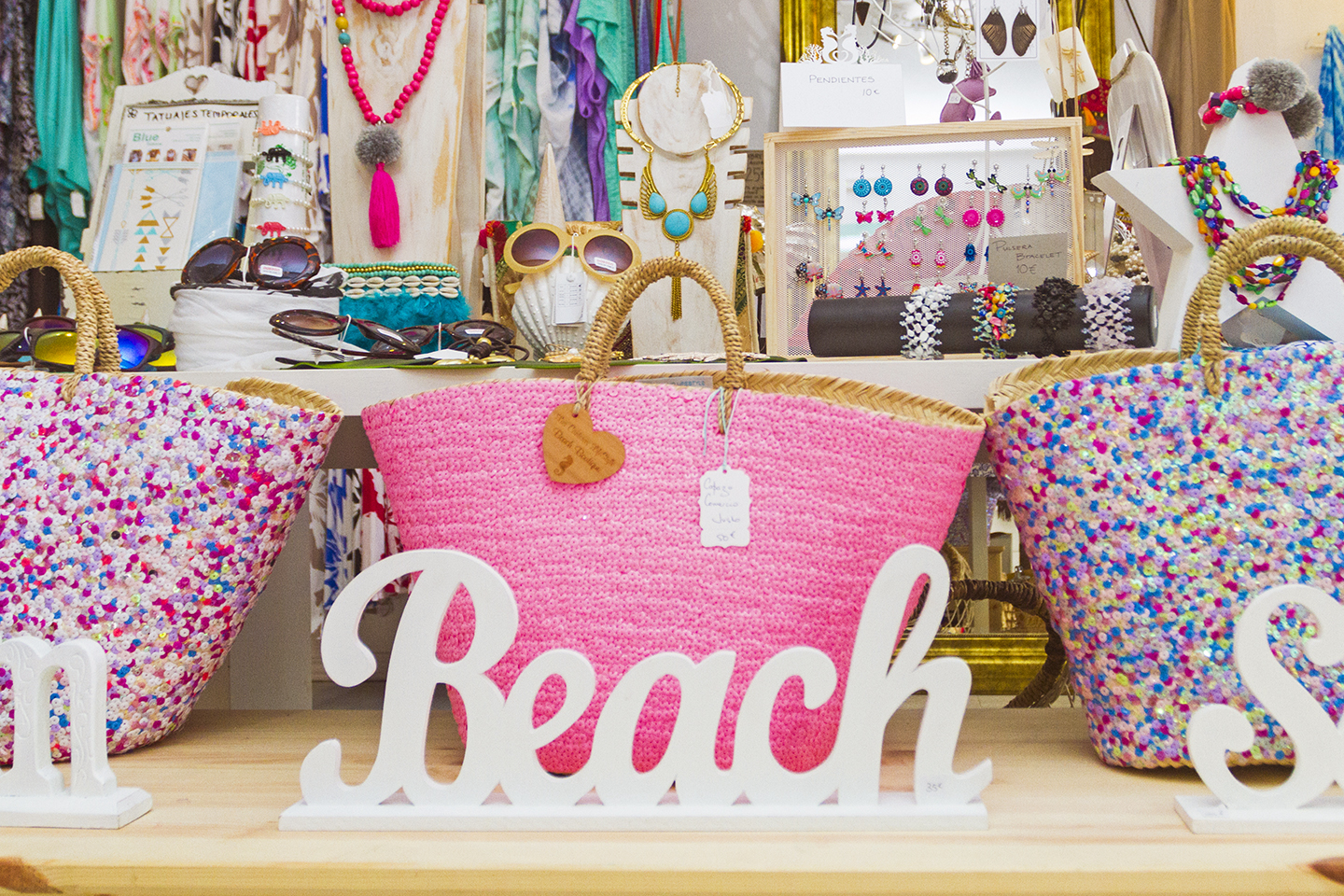 Once you're inside you'll find a cool (literally on a hot day) space packed with everything from jewelry, fashion accessories, beachwear and the best hats in town. There's everything from kaftans, pareos and beach bags to handmade jewelry and beach-themed cushion covers, rattan mirrors and carvings.