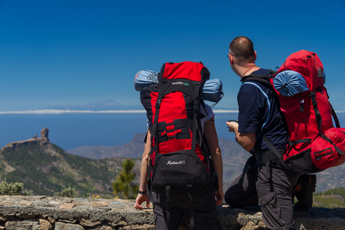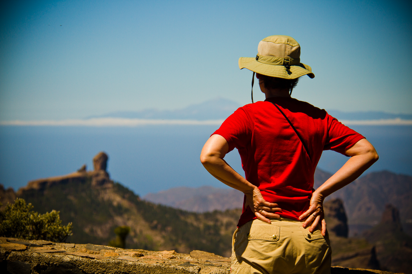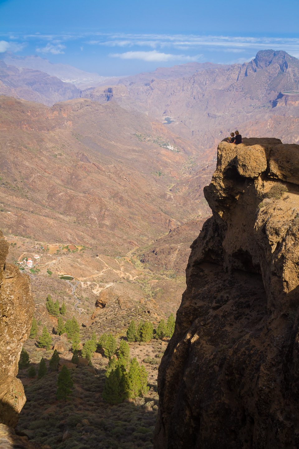 At the base of the rock walk left and you get to a little platform where you can sit and look out over west Gran Canaria and Teide volcano. The town in the far distance is La Aldea and the white patches are tomato greenhouses. In front of you is a tiny flat rock that's great for photos but too much for anyone with vertigo.